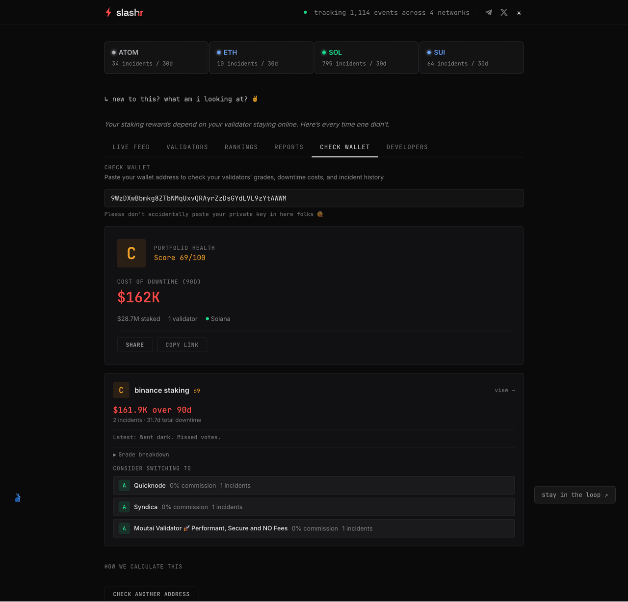 The product answers a question nobody else does: what is this costing me? Competing tools tell you what you'll earn. Slashr tells you what you've lost. The loss calculation engine is live, translating validator incidents into estimated dollar losses and assigning A-F portfolio grades.