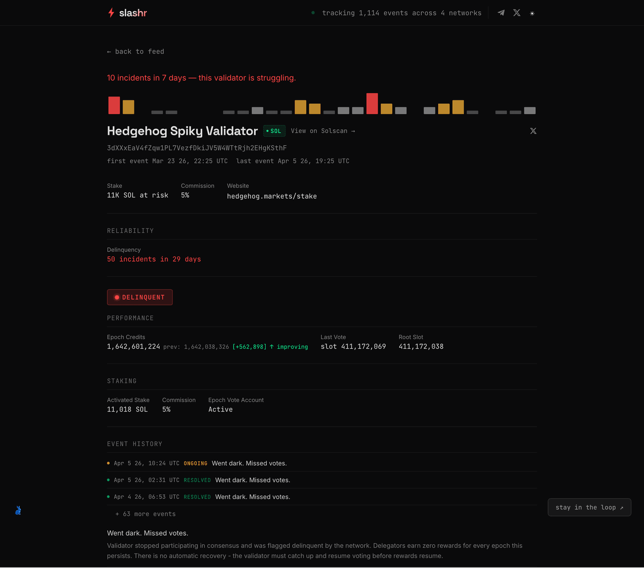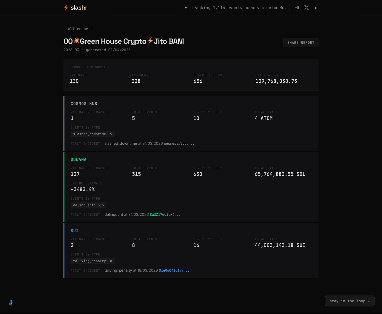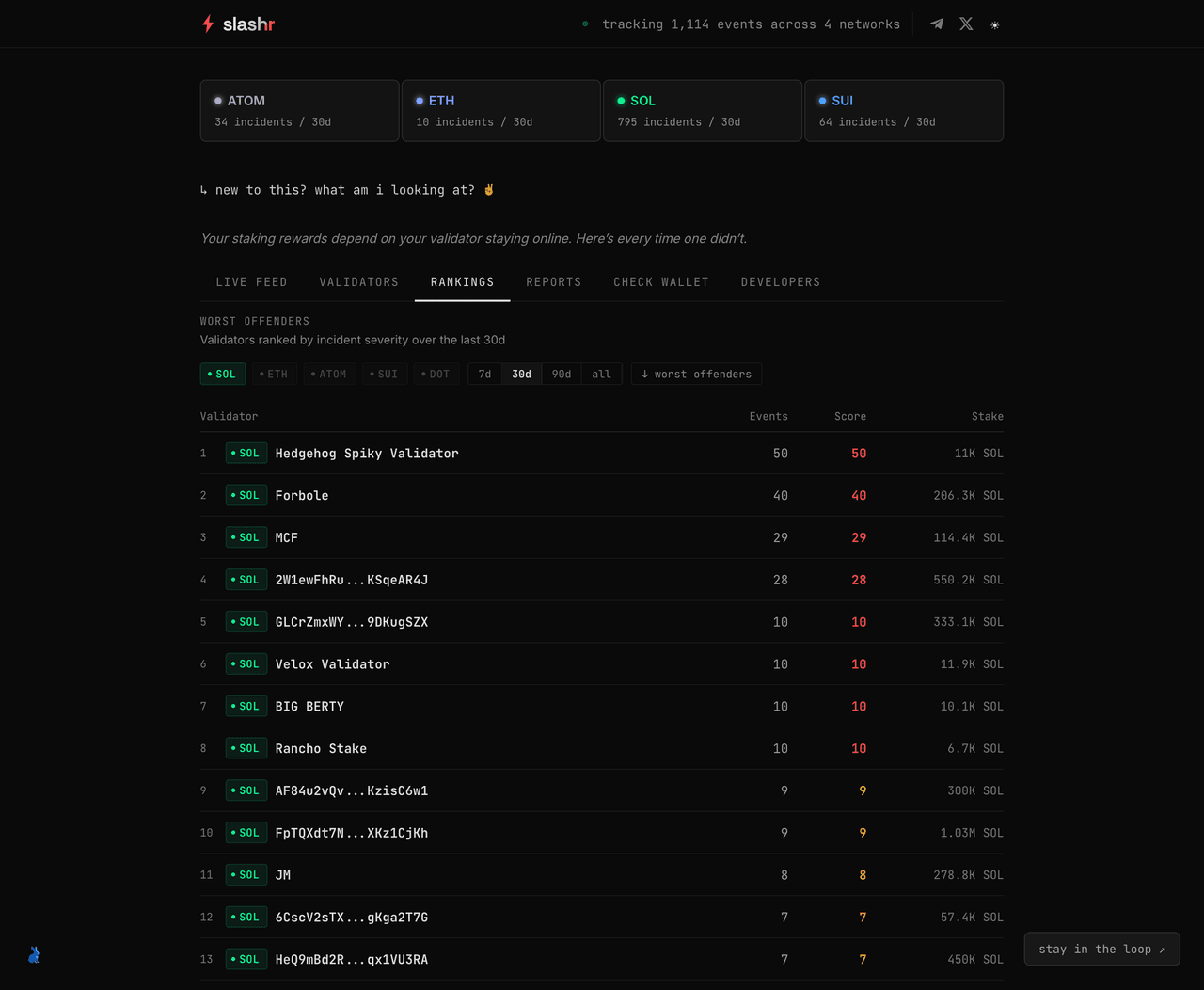 Slashr is a live, cross-chain validator incident tracking platform built by NullRabbit. It monitors delinquency, jailing, slashing, and missed vote events across Solana, Ethereum, Sui, and Cosmos -- in real time. Over 1,000 incidents have been tracked since launch, and the number climbs daily.