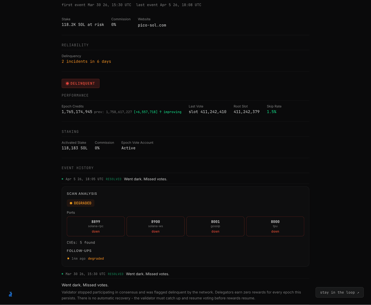 One thing we learned building this: Solana skip rate is a misleading metric for delinquent validators. When a validator is delinquent, it gets removed from the leader schedule entirely -- so its skip rate shows 0%. That looks great on paper. It's meaningless. We replaced it with a delinquency frequency metric that actually tells you something useful: "3 incidents in 21 days" is a much clearer signal than a skip rate that resets every time the validator falls off the schedule.